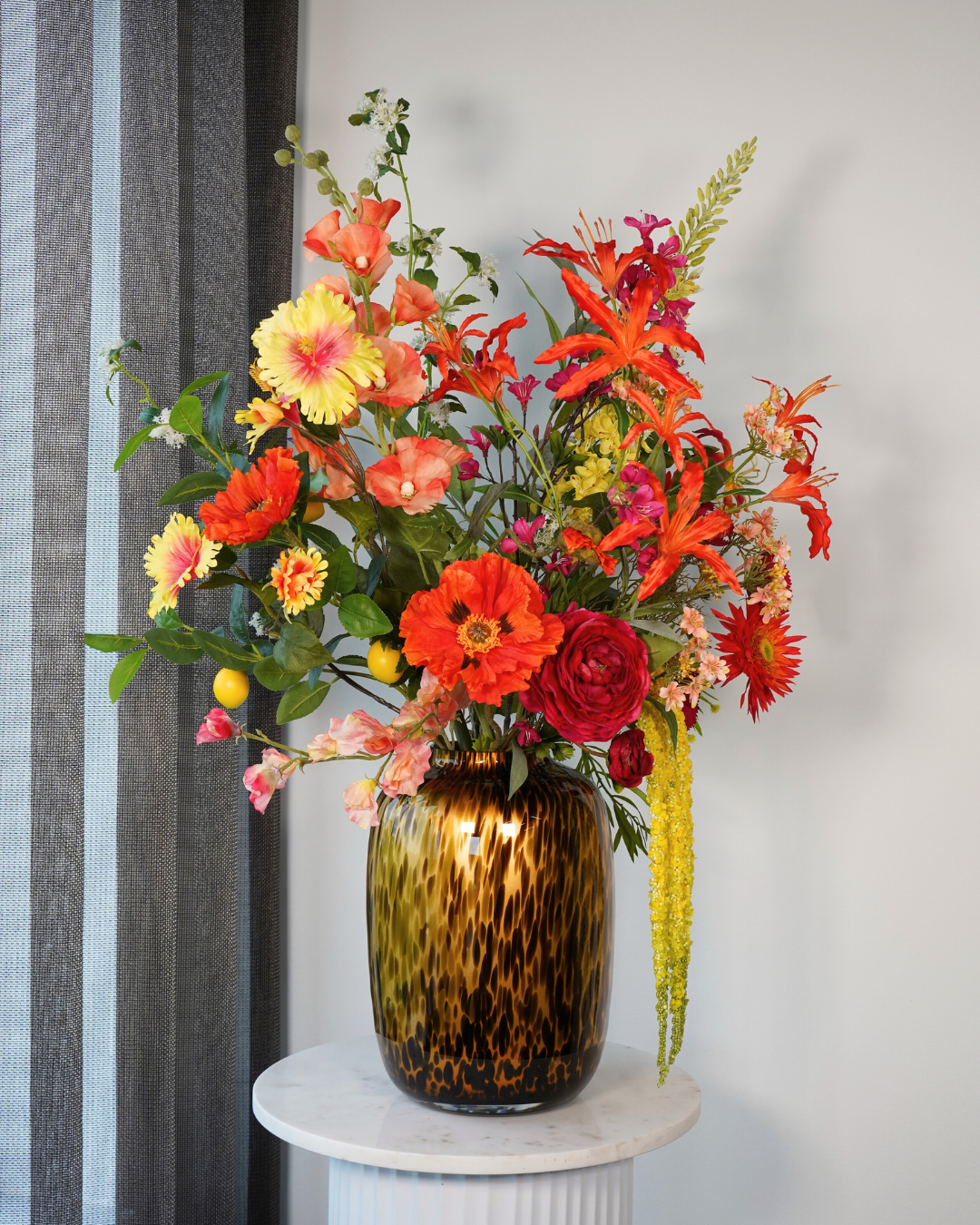 Boeket Leonie combineert vrolijkheid met elegantie. Geel-, oranje- en roze tinten dansen samen in een harmonieus, luxueus geheel. Leonie is een kleurig maar verfijnd boeket, dat energie, warmte en chique charme uitstraalt.