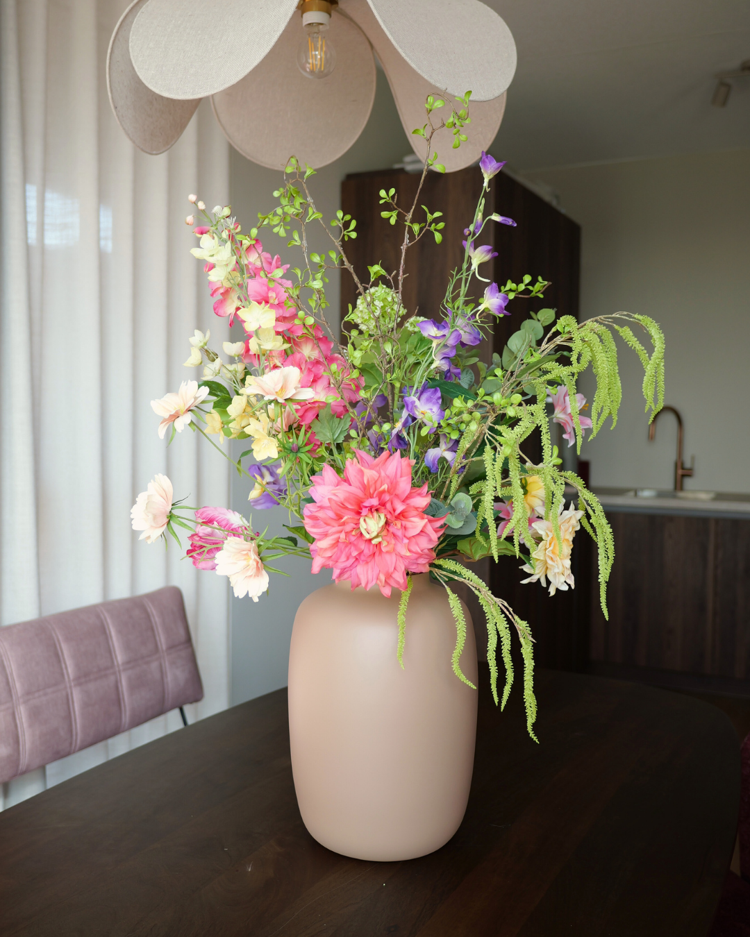 Het Boeket Pleun is een echte lentecombinatie die eigenlijk niet fout kan gaan. Paars, botergeel, lichtgroen en roze komen samen in een speels en harmonieus geheel. De kleuren versterken elkaar op een zachte manier en zorgen voor een frisse, vrolijke uitstraling in huis.